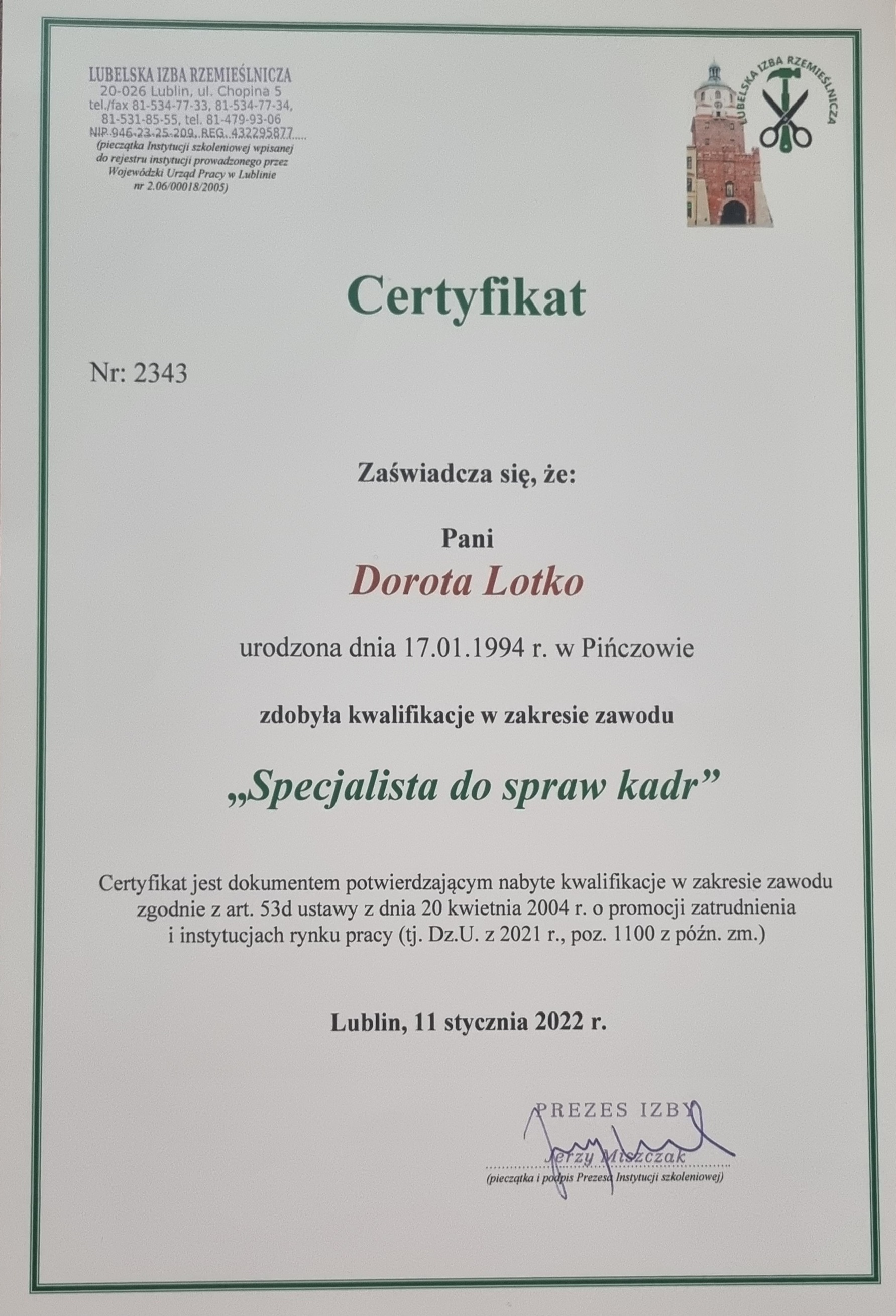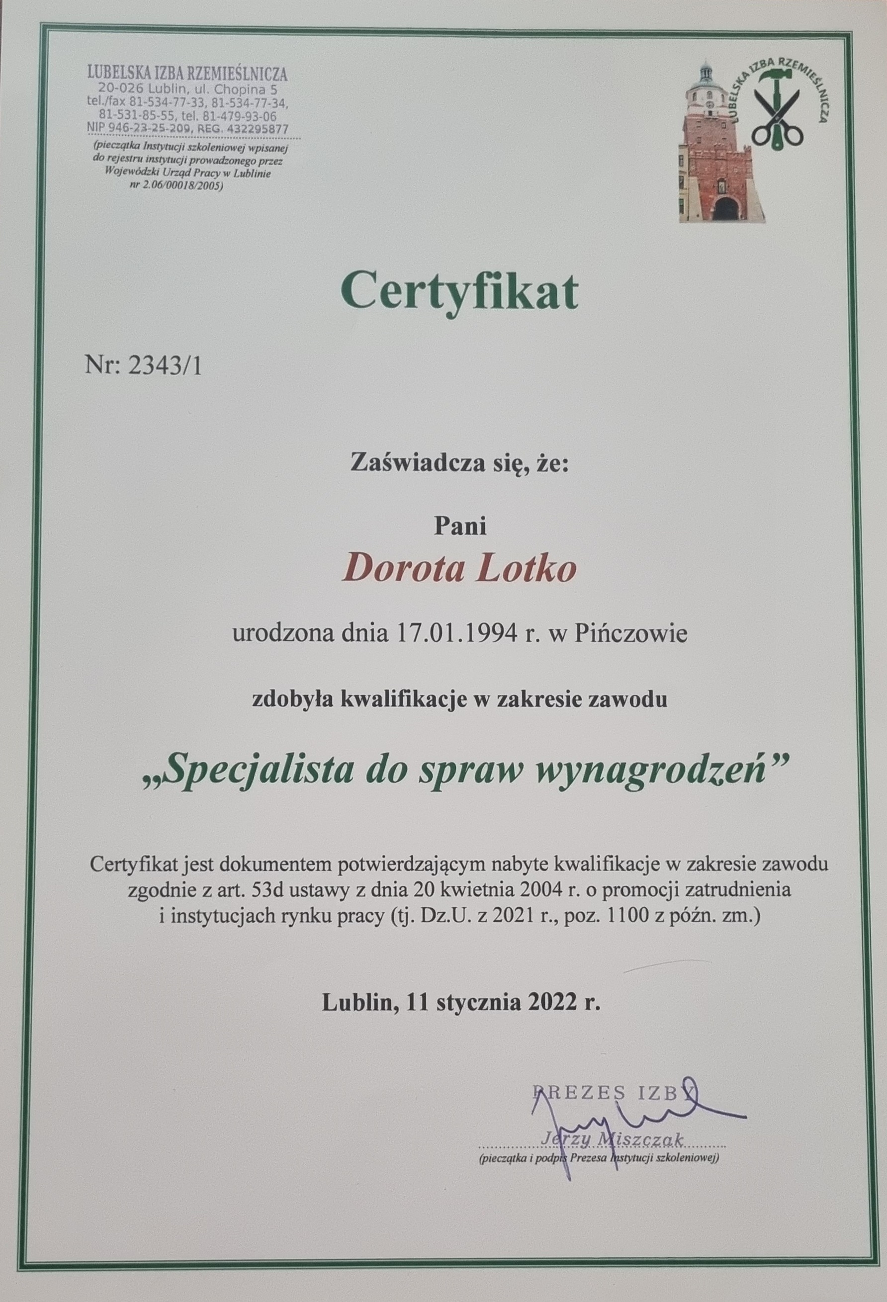 usługi na najwyższym poziomie. Moje kwalifikacje zawodowe potwierdza certyfikat Specjalisty