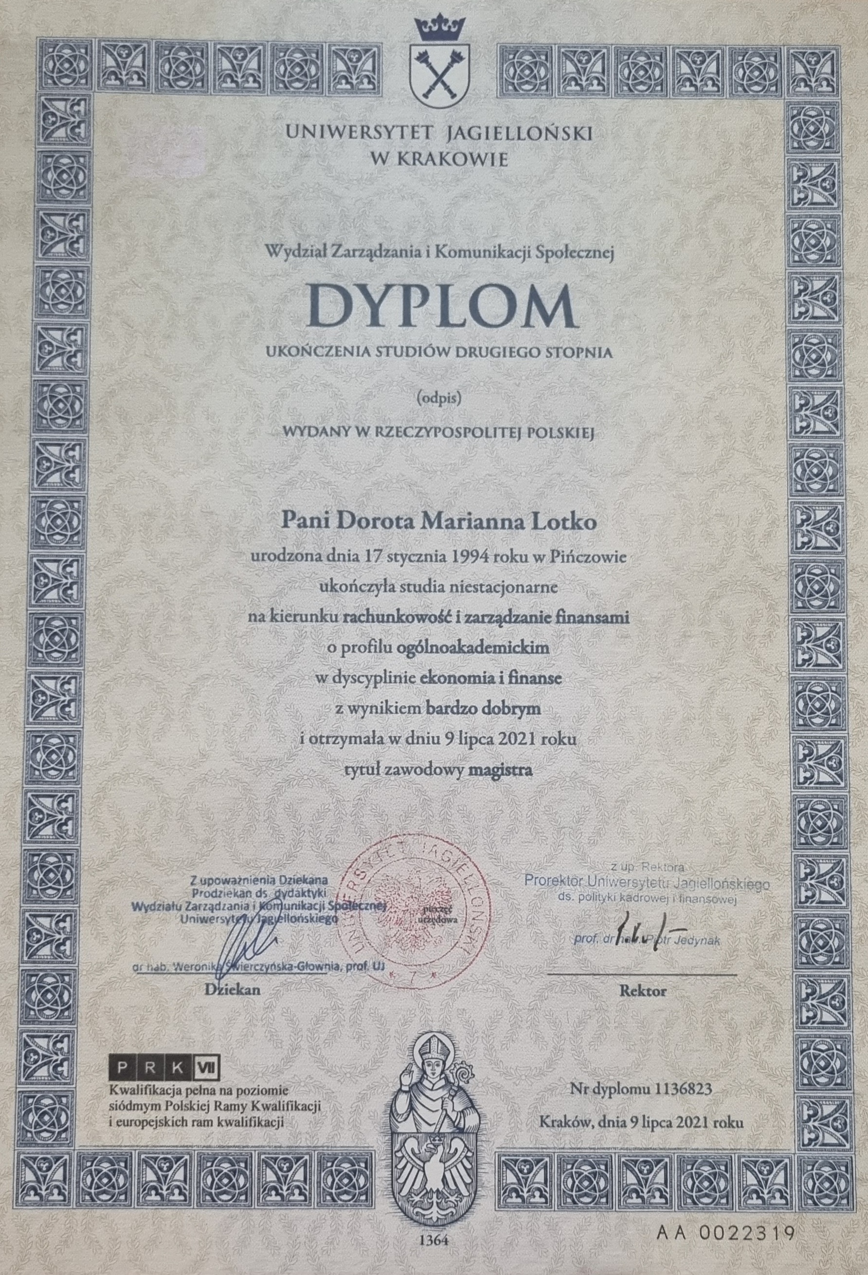 w specjalności Rachunkowość i zarządzanie finansami, gdzie uzyskałam tytuł magistra.